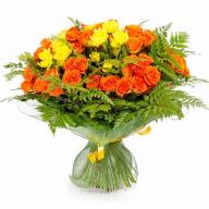 Оранжевые кустовые розы способны наполнить дом позитивной энергетикой. Желтые – символ радости, солнечного тепла, весны, они поднимают настроение и снимают усталость. Использование роскошных, зубчатых листьев папоротника придает композиции дополнительного объема и пышности. Расположенный по периметру, папоротник делает букет более эффектным и дорогим, а его темно-зеленые ветки создают невероятно красивый фон.